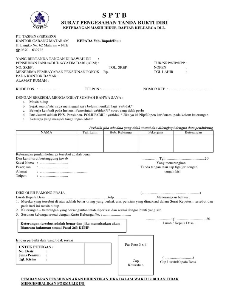 · surat keterangan kematian dari pemerintah . Mengisi formulir sptb yang di sahkan oleh lurah/kepala desa ; Bantuan beasiswa (taspen proteksi beasiswa*). Formulir sptb (khusus bagi penerima pensiun janda/duda). Mengisi surat keterangan janda / duda di sahkan .